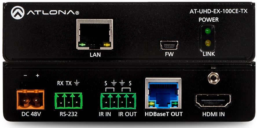 The AT-UHD-EX-100CE-TX is compatible with the AT-UHD-EX-100CE-RX receiver, as well as Atlona switchers and matrix switchers with HDBaseT inputs. See below for a list of compatible products. This transmitter is also ideal for extending AV and control to displays with HDBaseT inputs.