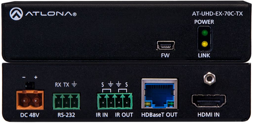 The Atlona AT-UHD-EX-70C-TX is an HDBaseT transmitter for HDMI transmission up to 230 feet (70 meters) over category cable with RS-232 and IR control. It transmits video signals up to 4K/UHD @ 60 Hz with 4:2:0 chroma subsampling, plus embedded multi-channel audio. The AT-UHD-EX-70C-TX is HDCP 2.2 compliant and supports EDID communication. This HDBaseT transmitter is externally powered by the included power supply, making it ideal for extending AV and control directly to a projector with an HDBaseT input.