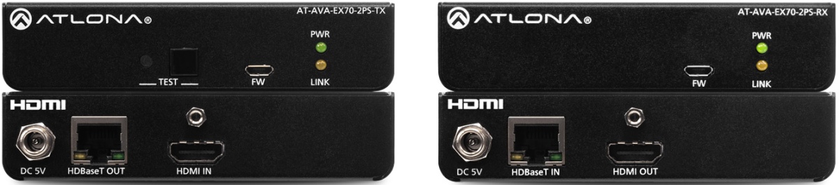 The Atlona AT-AVA-EX70-2PS-KIT is an Avance™ Series HDBaseT extender kit for transmitting 4K/UHD 60Hz 4:2:0 video up to 130 feet (40 meters) or 1080p 60Hz video up to 230 feet (70 meters). EDID filtering and clock stretching ensure video transmission integrity and stable connections. Integrated HDBaseT link test allows quick verification of cable, termination, and link quality. The AT-AVA-EX70-2PS-Kit is comprised of locally powered transmitter and receiver endpoints. Compact enclosures and included brackets allow the devices to be surface mounted in furniture or behind a display. The AVA-EX70-2PS-KIT delivers a cost-effective solution for extension of video and audio at resolutions up to 4K/UHD.