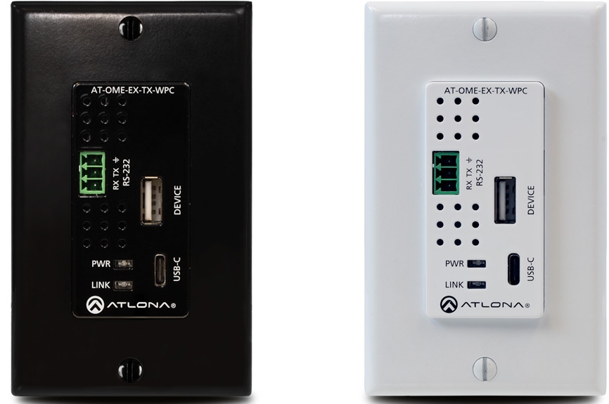The Atlona AT-OME-EX-TX-WPC is an HDBaseT transmitter with USB-C input. It sends video up to 4K/60 4:2:0, plus embedded audio, control, and USB over distances up to 330 feet (100 meters). It features a US one-gang, wallplate form factor, and includes interchangeable black and white wallplates and faceplates. Part of the Omega™ Series of integration products for modern AV communications and collaboration, the OME-EX-TX-WPC is HDCP 2.2 compliant and extends RS-232 control signals. The USB-C input is ideal for AV interfacing with newer Mac®, Chromebook™, and Windows® PCs, as well as smartphones and tablets. With a matching HDBaseT receiver, the integrated USB extension addresses the challenge of connecting between USB devices at remote locations, and is ideal for software video conferencing and touch or interactive displays. The OME-EX-TX-WPC includes a PC host interface over USB-C, plus a USB 2.0 interface for a peripheral device such as a speakerphone, microphone, or keyboard and mouse. This transmitter is ideal for use with Omega Series receivers as well as switchers with HDBaseT inputs.