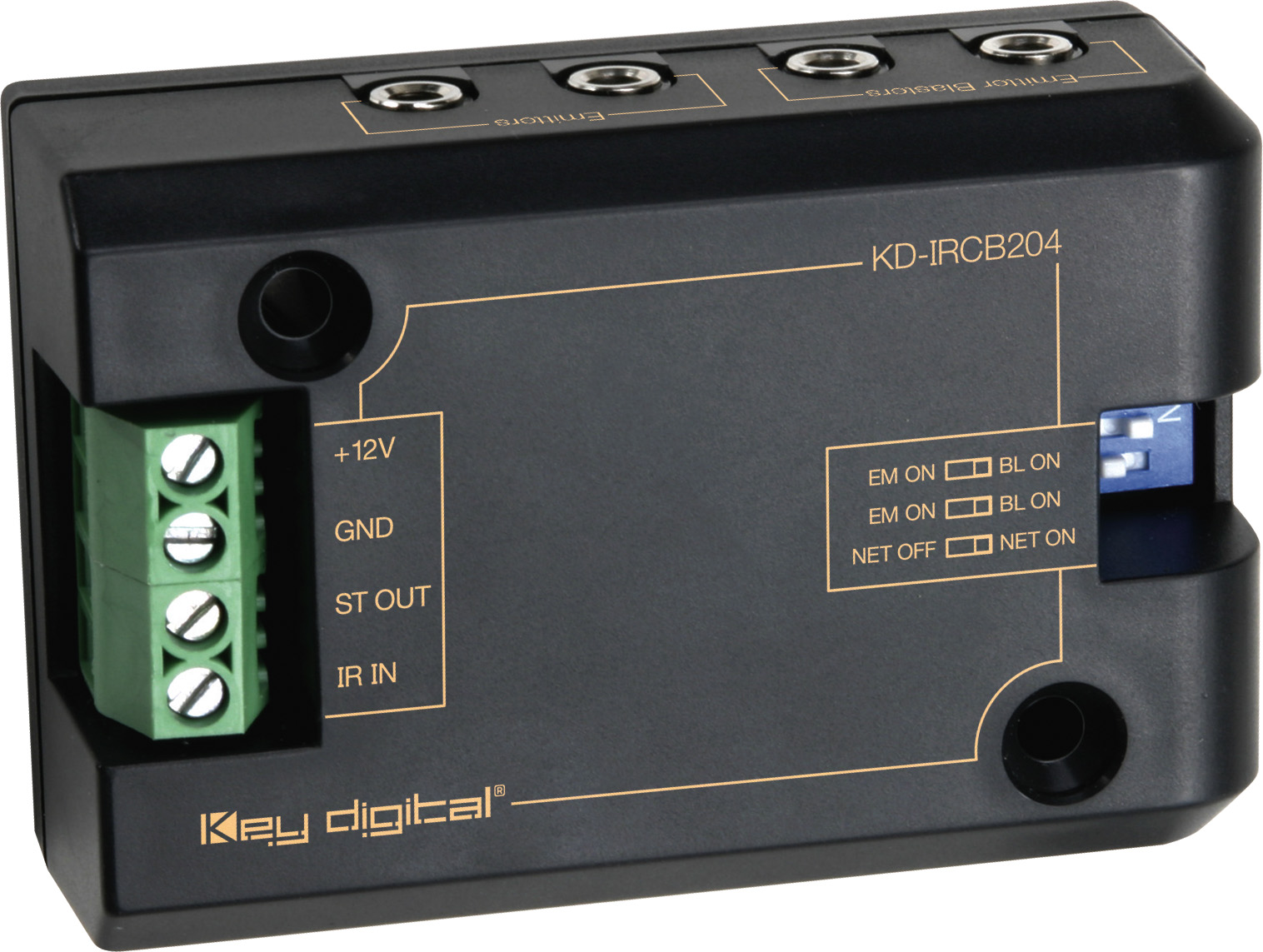 The KD-IRCB204 is the connecting block of your IR control and amplification system. The KD-IRCB204 device connects IR receivers and emitters, extending the IR system interface to audio/video components and is capable of supporting two (2) IR receivers and up to four (4) IR emitters with the ability of expansion by connecting multiple units together.