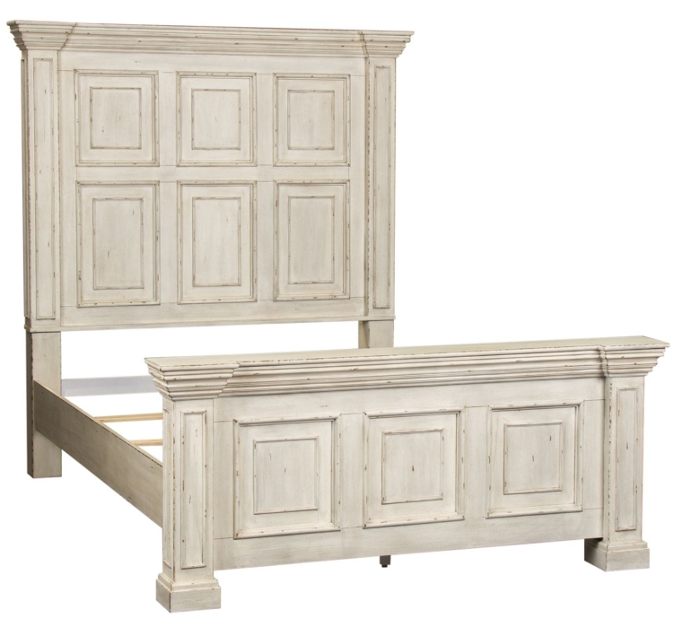 This unique panel bed is the perfect way to enhance your room with traditional living design. The white stone finish accompanied by heavy distressing creates a truly unique look. Crafted with rubberwood solids and wood products, this piece features a heavy crown molding and sturdy bolt on rails, all anchored by block feet.Read More