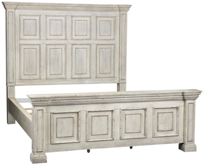 This unique king California panel bed is the perfect way to enhance your room with traditional living design. The white stone finish accompanied by heavy distressing creates a truly unique look. Crafted with rubberwood solids and wood products, this piece features a heavy crown molding and sturdy bolt on rails, all anchored by block feet.Read More