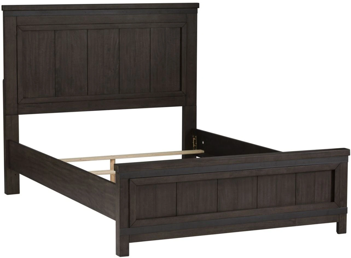 Add a natural feeling to your living space using the Thornwood Hills panel bed. Crafted with rubberwood solids and mango veneers, the rock beaten gray finish is highlighted by saw cuts and hammered metal strip accents across the planked headboard and footboard.Read More