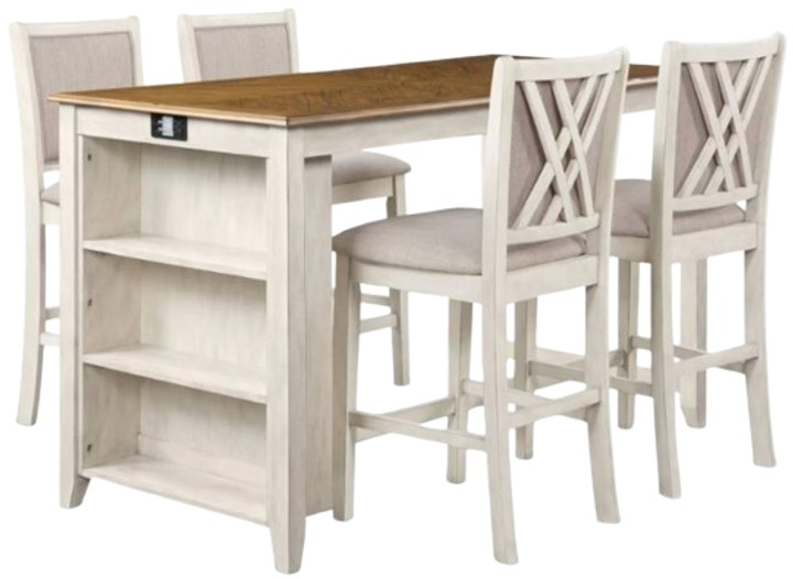 The Amy 5-piece 60” counter dining set is a perfect union of practicality and. This comprehensive set includes a counter-height 60" dining table with a convenient storage shelf, four chairs, along with hardware, and assembly instructions for hassle-free setup.Read More