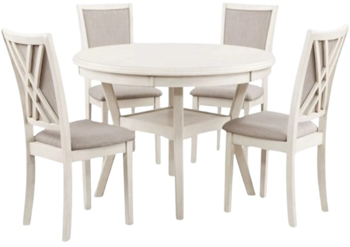 The meticulously crafted Amy 5-Piece Wood Round Dining Set includes a spacious 47" round dining table and four chairs, designed for both durability and beauty. The solid Rubberwood and Mindi veneer construction ensures lasting quality, while the cozy farmhouse bisque finish enhances the natural grain of the wood.Read More
