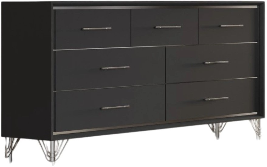 The Ava collection exudes modern elegance and refined luxury. Featuring a panel bed, 2 drawer nightstand, 7 drawer dresser, mirror, and 5 drawer chest, each piece is crafted from engineered wood with eco-friendly black laminate.Read More