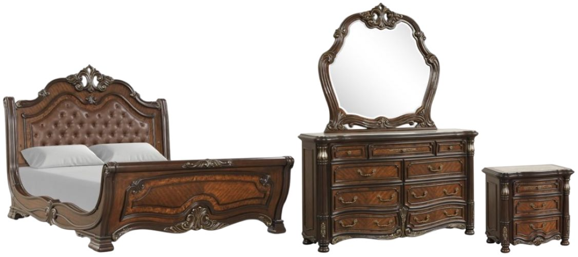 The Bella Notte bedroom set in mahogany brown brings timeless luxury to your space. Crafted with poplar, veneers, and burl inlays, each piece features ornate antique gold accents, marble and velvet details, and smooth storage. This elegant set delivers beauty, durability, and functionality for a truly refined retreat.Read More