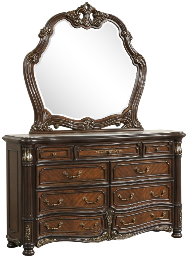 The Bella Notte dresser and mirror showcases timeless elegance with rich wood craftsmanship and ornate details. Featuring nine spacious drawers, velvet-lined storage, and a real marble inlay, the dresser pairs beautifully with the intricately carved beveled mirror, creating a luxurious centerpiece that elevates any bedroom.Read More