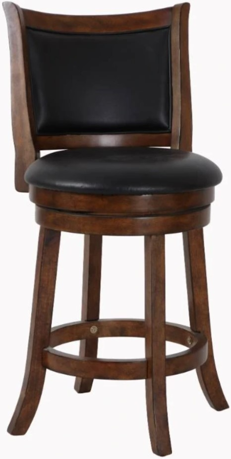The circular footrest adds stability and functionality to the stool legs, while the 360-degree swivel feature allows for easy use at a kitchen island or bar. With a 24” seat height, the full foam seat cushions and backrest, upholstered in easy-care black PU fabric, provide a plush and cozy seating experience. The distinctive style is highlighted by the flared chair frame and thickly welted back cushions, evoking a classic barstool character. Assembly is a breeze with the included instructions, and a one-year warranty ensures your satisfaction. Elevate your bar or kitchen island with the Bristol Counter Height Swivel Bar Stool, where quality construction meets distinctive style.