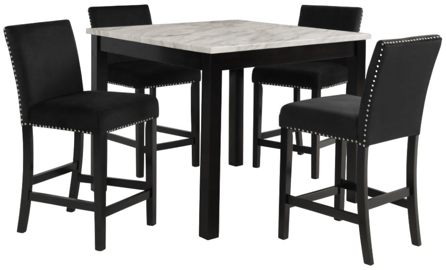 The Celeste 5-Piece Counter Height Dining set is a perfect blend of contemporary glamour and timeless functionality. This set includes a 42-inch square counter height dining table with an espresso base and a faux marble top featuring white with gray veining.Read More