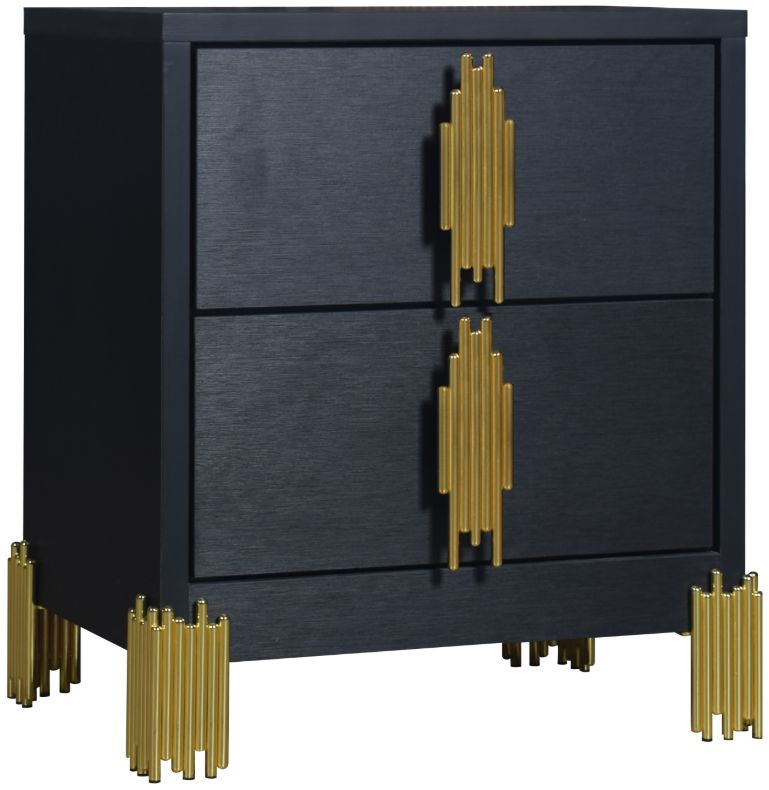 Introducing the Empire 2 drawer nightstand in sleek black, a stylish addition to any bedroom. Crafted with lasting durability in mind, this nightstand features eco-friendly materials and a sophisticated finish for a contemporary touch. Its gleaming gold drawer pulls and feet evoke the charm of a city skyline at night.Read More