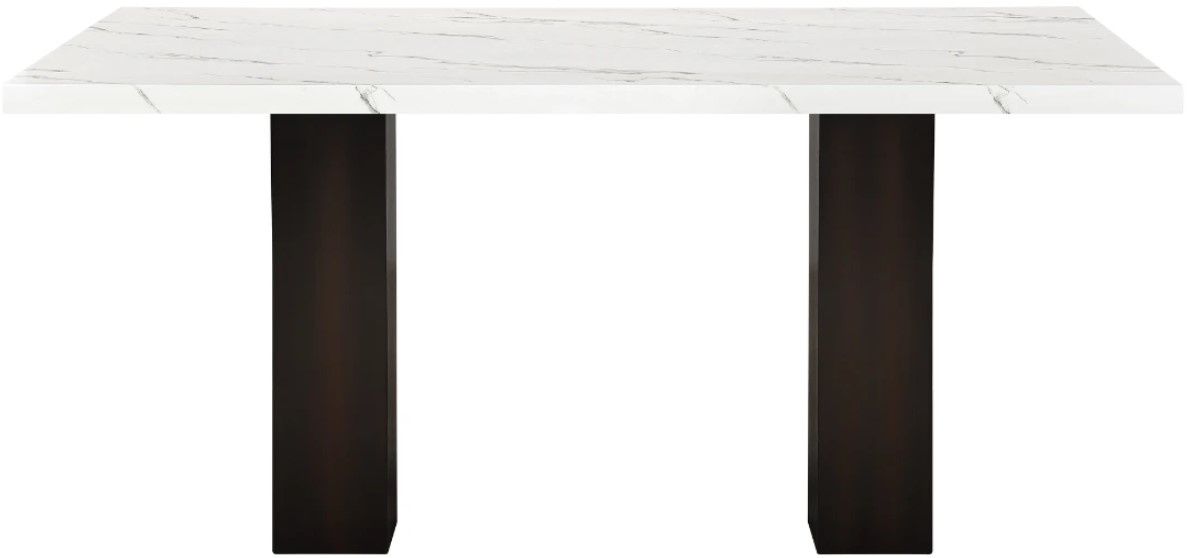 Contemporary Style: This dining table's sleek white faux marble tabletop with subtle gray veining provides a modern and luxurious aesthetic. The dark pedestal legs offer a bold contrast and add to the table's contemporary appeal