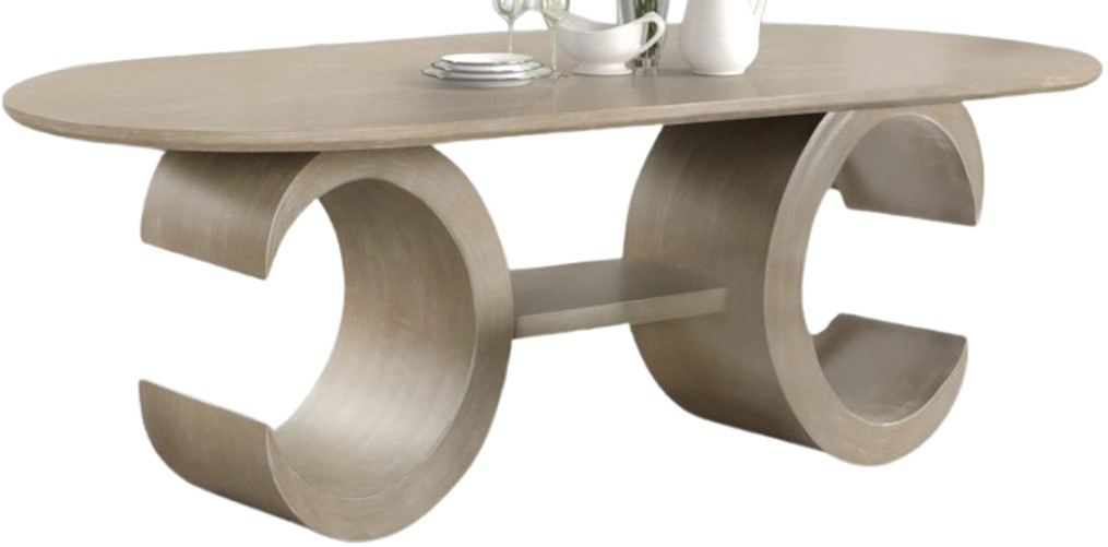 The Gwendolyn oval dining table in cerused taupe blends durability, elegance, and artistic design. Crafted from solid rubberwood and oak veneers, it features a sculptural dual curved base and sleek silhouette. The 86" length seats six comfortably, while the cerused taupe finish with enhanced wood grain offers a calming, versatile look, perfect for modern.Read More