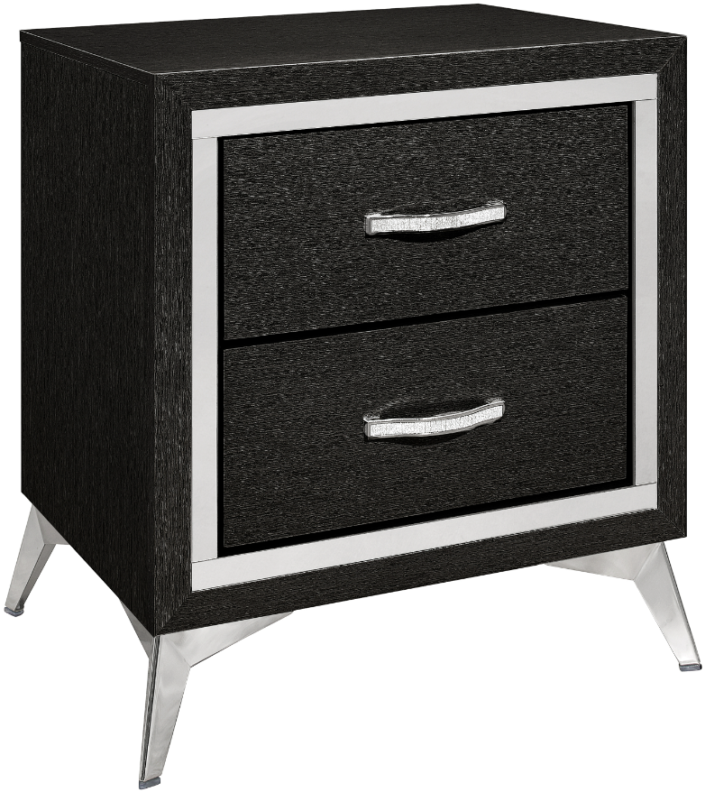 The Huxley 2-Drawer Nightstand in black offers a blend of contemporary glam and durable construction for your bedroom. This nightstand is carefully crafted from manufactured woods and eco-friendly decorative laminate, ensuring it will last for years. The design features clean lines with metallic accents and flared silver legs.Read More