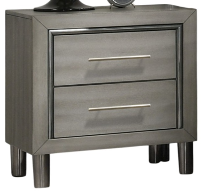 The furniture features a specialty metallic finish over wood that mimics the modern, polished look of stainless steel while offering exceptional durability and scratch resistance. It enhances the light gray finish, adding a sleek, sophisticated touch ideal for a contemporary ambiance.