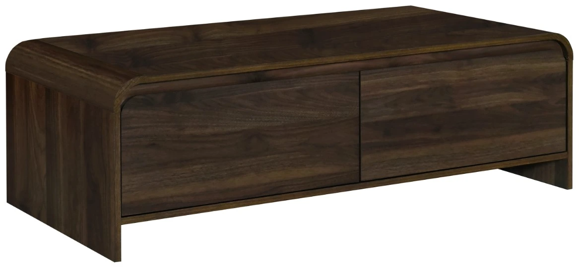 Introducing the Mara storage cocktail table in walnut, versatile and sustainable centerpiece for your living room. Crafted from sturdy manufactured wood and coated in environmentally friendly laminate, this table offers both durability and eco-consciousness. Its 47" surface area provides ample space for drinks and decoration, while two roomy drawers discreetly store reading materials.Read More