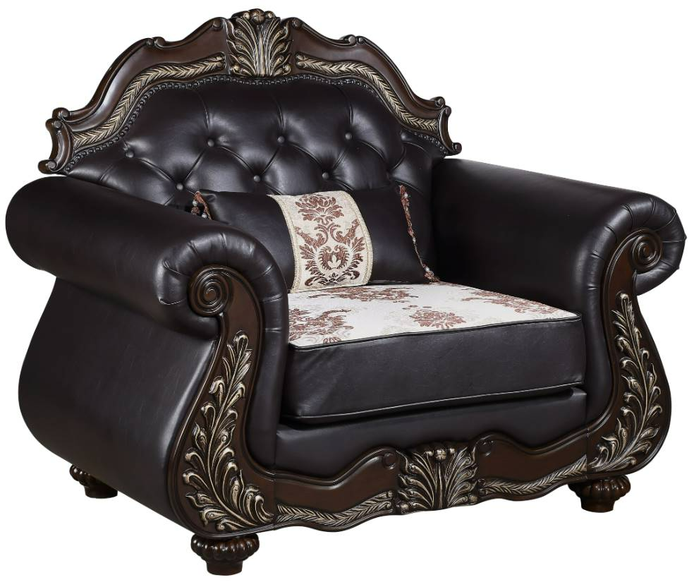 Each piece is expertly constructed from solid pine with premium polyurethane carvings, providing both durability and intricate detailing that resists moisture, rot, and cracking. The collection’s signature multi-step cherry finish enhances the natural beauty of the wood, while delicately burnished gold tipping highlights the elaborate Rococo-style ornamentation. Upholstered seating pieces feature rich brown vegan leather with button-tufted backs and nailhead trims, accompanied by elegantly patterned accent pillows, offering both comfort and a refined, decorator-quality look. The occasional tables are topped with luxurious marble surfaces, boasting deep brown tones and white veining for a sophisticated contrast. This collection seamlessly combines regal elegance with long-lasting performance, making it perfect for refined living spaces.