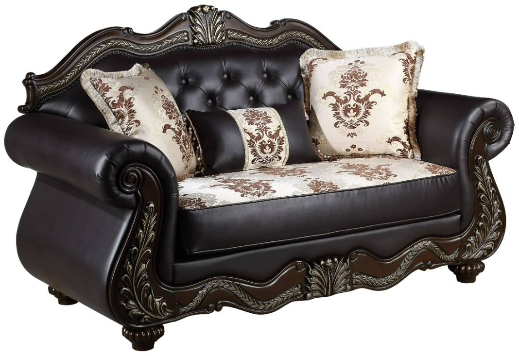 Each piece is expertly constructed from solid pine with premium polyurethane carvings, providing both durability and intricate detailing that resists moisture, rot, and cracking. The collection’s signature multi-step cherry finish enhances the natural beauty of the wood, while delicately burnished gold tipping highlights the elaborate Rococo-style ornamentation. Upholstered seating pieces feature rich brown vegan leather with button-tufted backs and nailhead trims, accompanied by elegantly patterned accent pillows, offering both comfort and a refined, decorator-quality look. The occasional tables are topped with luxurious marble surfaces, boasting deep brown tones and white veining for a sophisticated contrast. This collection seamlessly combines regal elegance with long-lasting performance, making it perfect for refined living spaces.