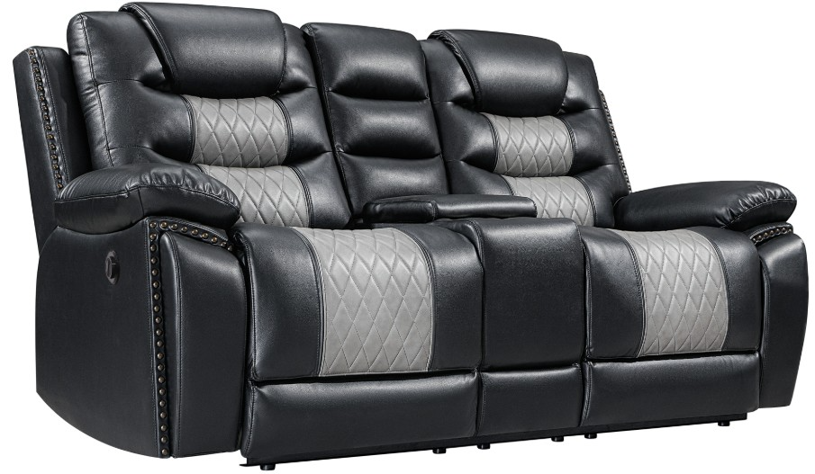 Experience luxurious comfort with resilient foam cushions and pocket coil seating, offering a cozy lounging experience. The soft, two-tone black and gray fabric, made from 80% polyester and 20% PU, provides the touch and feel of leather while remaining breathable. Distinctive details such as nailhead trim, diamond stitch pattern seats, and double wrapped headrests add elegance to any home. Enjoy lifestyle features like the drop-down snack tray with beverage holders in the sofa, extra storage in the console loveseat, and hidden pull-out cupholders in the arms. In the power version, keep your devices charged up with convenient USB ports and find your perfect recline position at the touch of a power button. Plush pillowed arm and headrests, reclining backs, and comfortable footrests create the ultimate relaxation spot. The glider recliner offers soothing, gentle gliding action for added comfort. The Nikko motion upholstery set is the ideal blend of style, comfort, and modern convenience.
