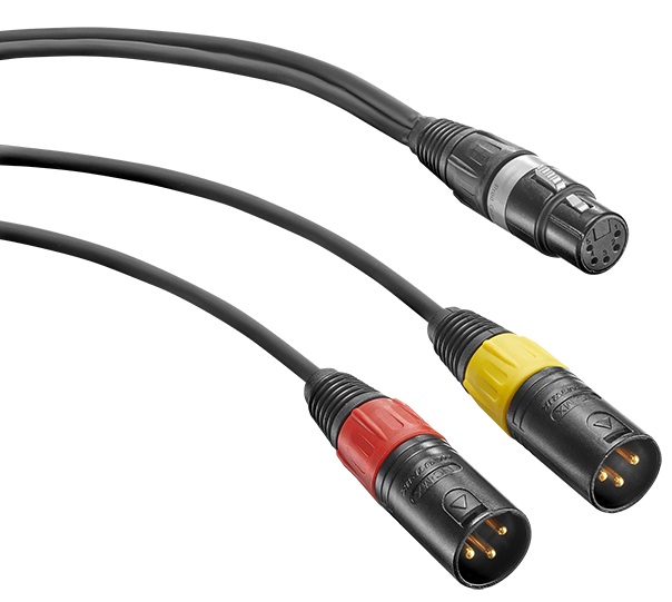 Y-cable with one XLR 5 F connector and two XLR 3 M connectors. It is used to split two-channel signals into two mono channels, when using, for example, the BS 48 i-2 power supply.